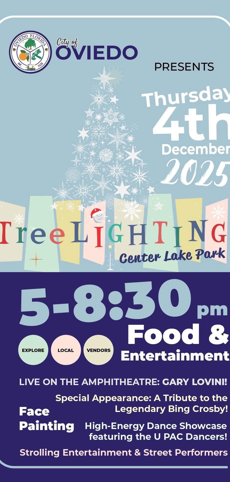 Gary Lovini LIVE in Oviedo! Celebrate the season at the Oviedo Tree Lighting Ceremony and enjoy an electrifying live performance by Gary Lovini! Date: Thursday, December 4, 2025 Event Times: